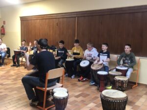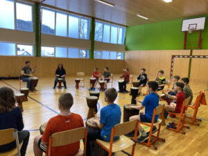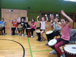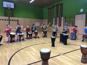 Am 2. und 3. Februar kamen Berni und Gabi Putz zu uns an die Schule, um mit den SchülerInnen einen Tanz- und Trommelworkshop zu machen. Bei diesem dreistündigen Workshop lernten wir etwas über traditionelle Musik und Tänze aus Afrika. Wir trommelten verschiedene Rhythmen und sagen dazu Lieder aus Afrika, auch tanzten wir zu dieser Musik. Wir lernten viel Neues und hatten großen Spaß. – Marie Halbartschlager (Schulsprecherin)
