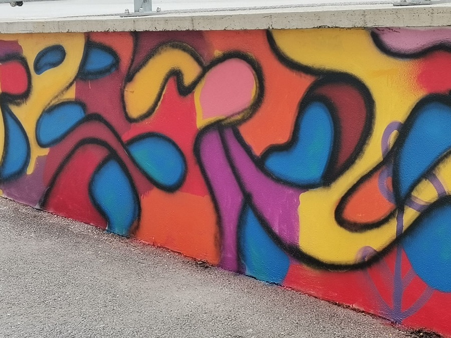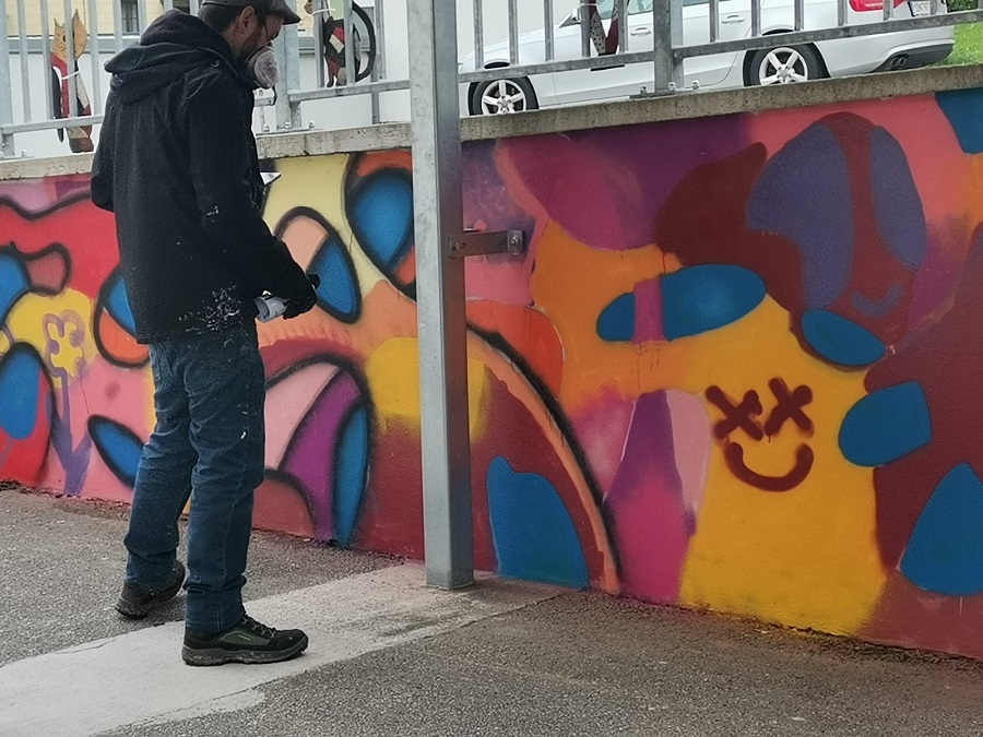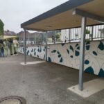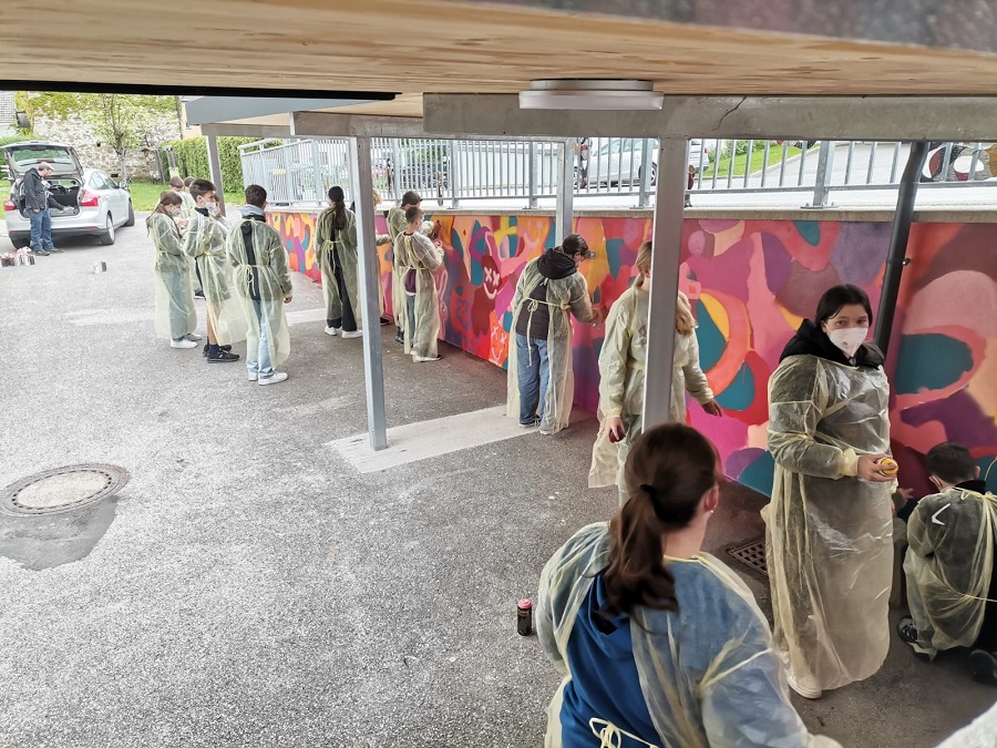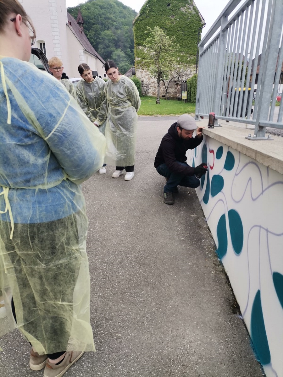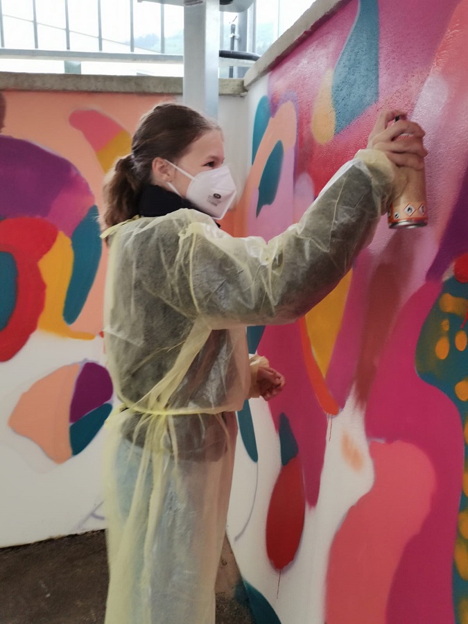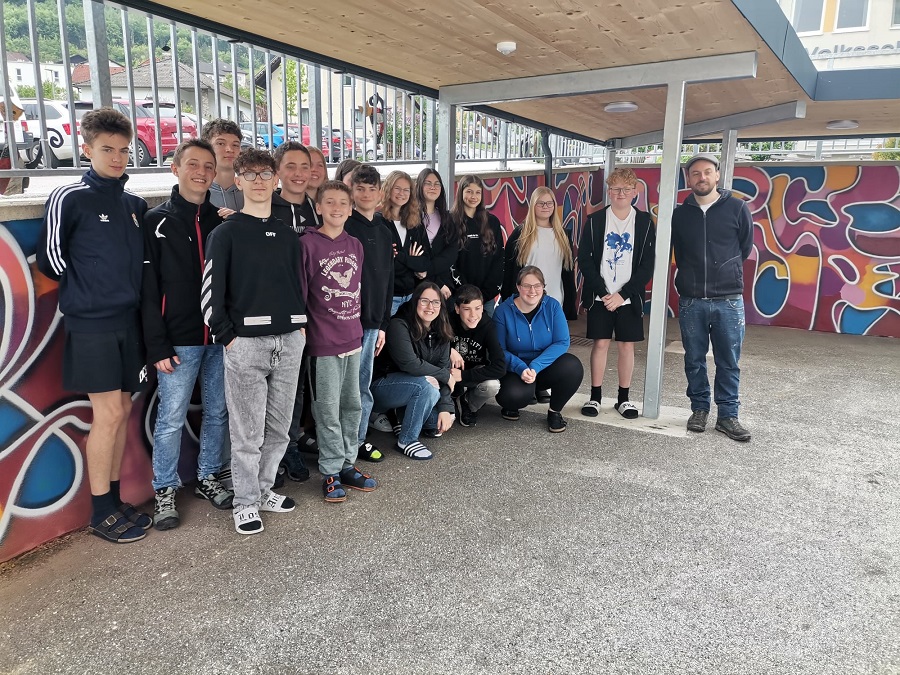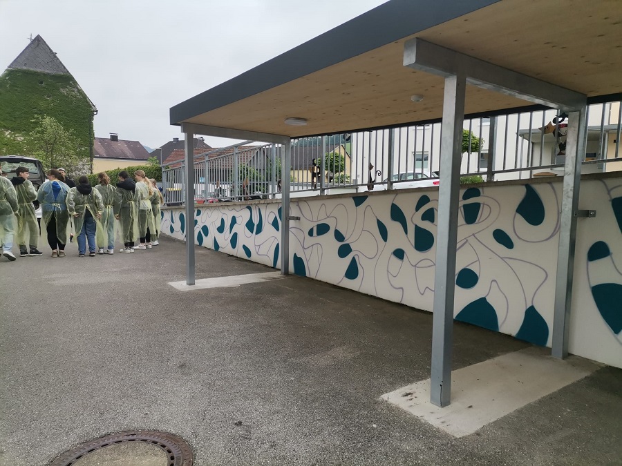 In einem Projekt zwischen Schule und Gemeinde haben die Schülerinnen und Schüler den Plan zur Umgestaltung des Schulhofes entwickelt. Dabei entstand der Wunsch, einige Mauern mittels Graffities zu gestalten.